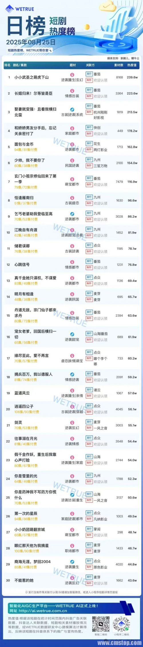 1、本日榜为WETRUE短剧数据公司提供,新腕儿和鞭牛士提供联合支持。
