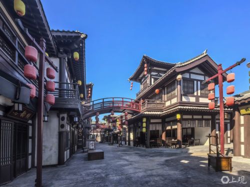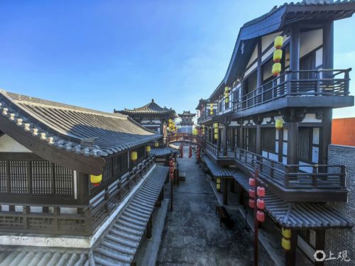 位于嘉定安亭的上海国际短视频中心占地8000多平方米的古装微短剧内外景基地,有灯火流转的古风街市集,包括商铺、戏台、客栈、街道等。