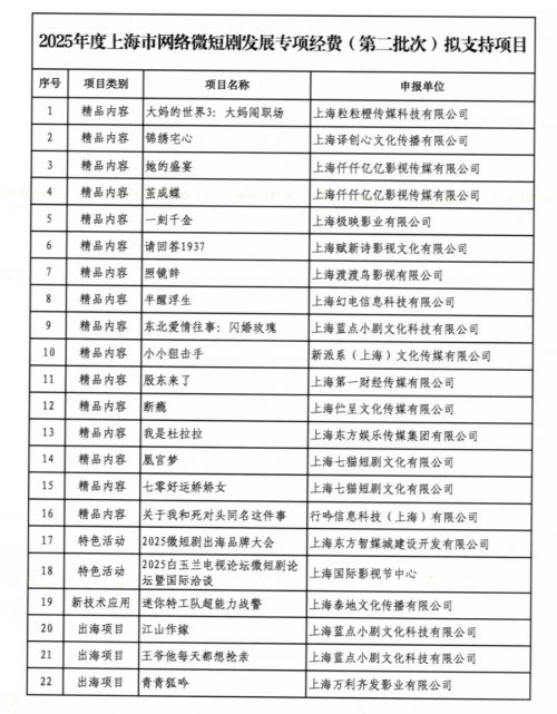 日前,上海市文化和旅游局发布公示,公布2025年度上海市网络微短剧发展专项经费(第二批次)拟支持项目名单,公示期为2025年11月28日至12月4日。